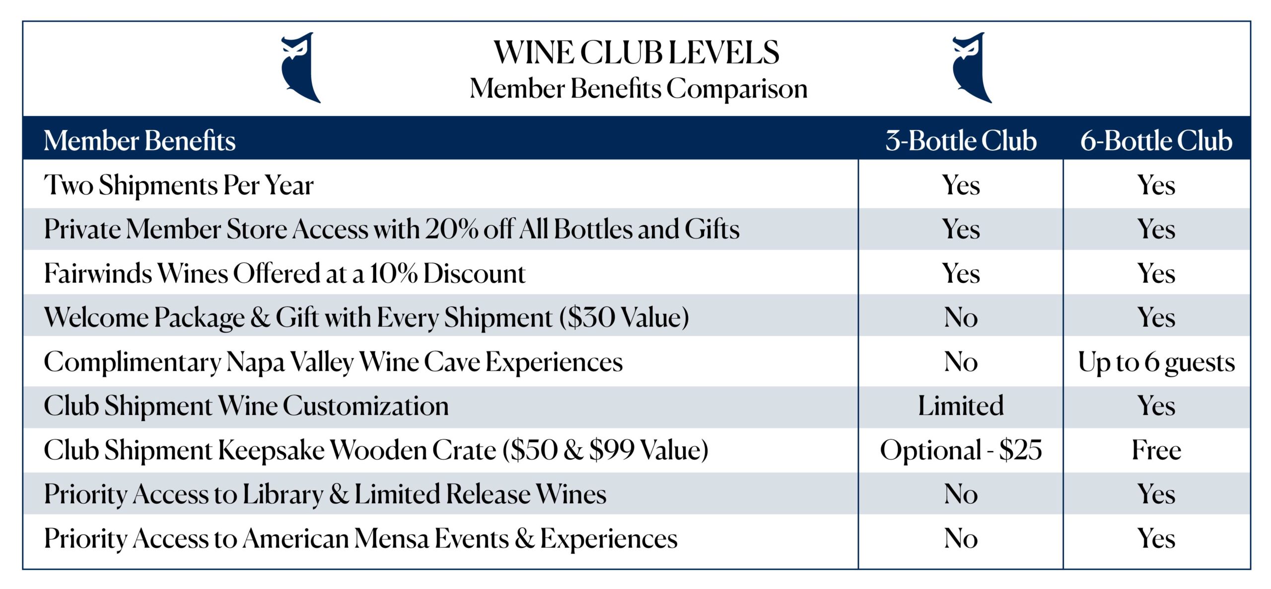 Please review the Great Minds Club member levels and benefits on the comparison matrix presented on this page. Enjoy your wine, and remember, when you share a glass, gift a bottle or visit the Fairwinds tasting room in Napa Valley together, you are supporting American Mensa!